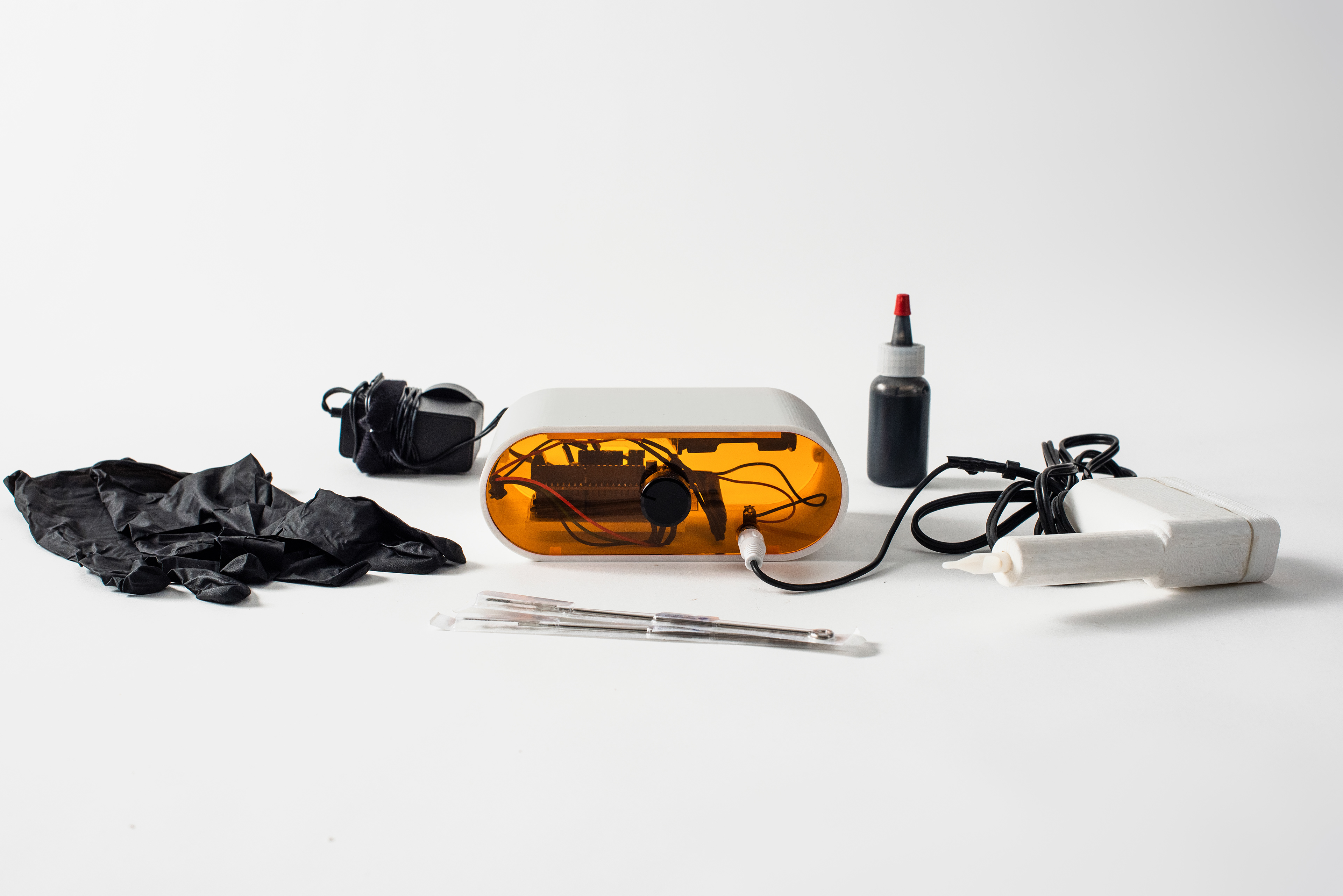 - PLA 3D printed components, acrylic, electronic components, tattoo needle, PLA/saline solution, latex-free gloves, and fasteners